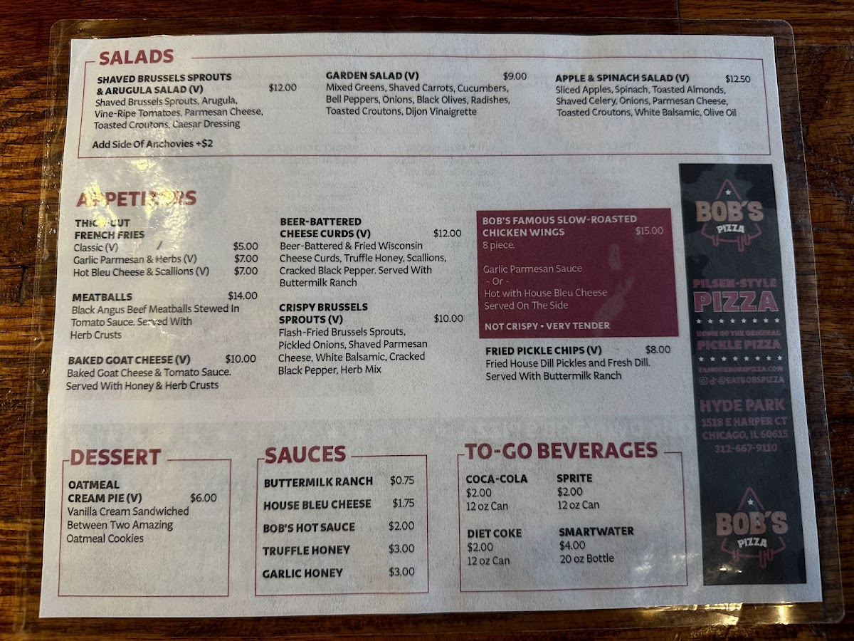 Welcome to Bob's Pizza, a gem nestled in Hyde Park, Chicago. This pizzeria offers an array of mouthwatering options that will satisfy any pizza lover’s cravings. Among the highlights is Bob's Margherita Pizza, featuring vine-ripened tomatoes, creamy stracciatella cheese, and fresh basil, all drizzled with white balsamic. For those seeking a classic, the Cheese Pizza is hand-stretched and quick-fired, topped with premium mozzarella. Meat lovers will delight in the Sausage Pizza, made with locally sourced Italian sausage.
